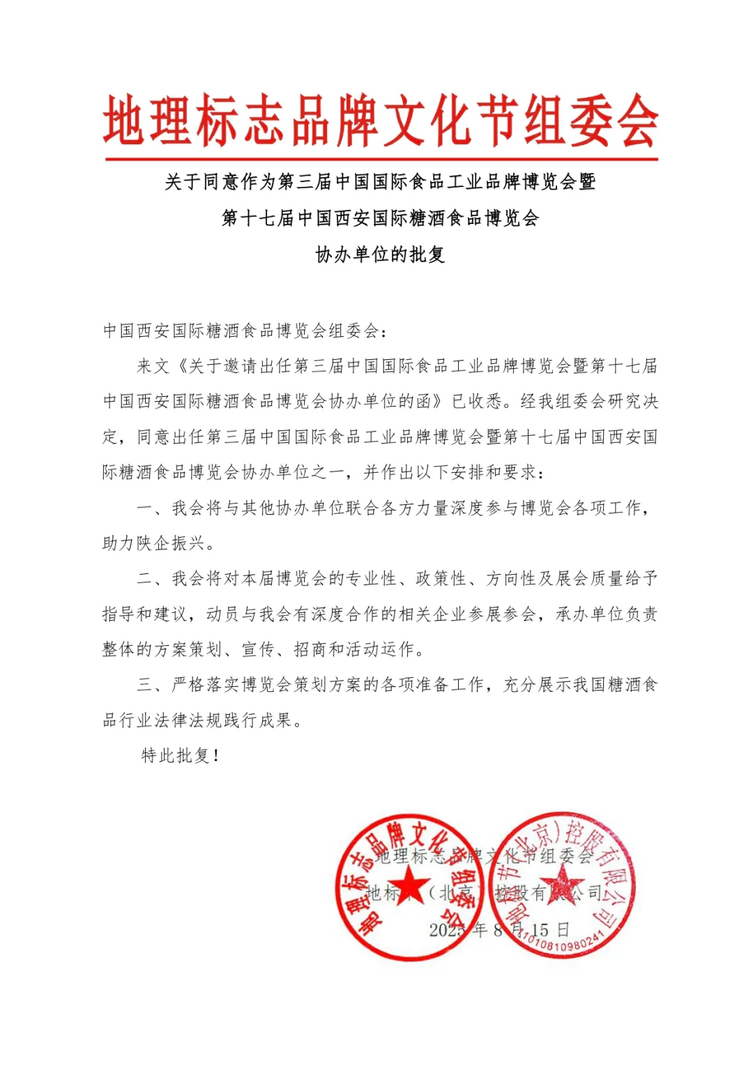 喜訊:地理標志品牌文化節(jié)組委會同意出任第三屆中國國際食品工業(yè)品牌博覽會暨第十七屆中國西安國際糖酒食品博覽會協(xié)辦單位之一